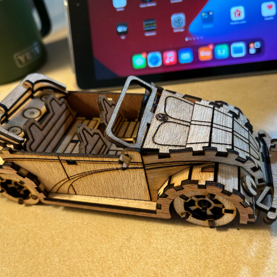 A nice challenge. Overall good project. When I went to assemble the car I found a couple of parts missing from the svg cut sheet when two were called for but I just went back and cut more. Ok