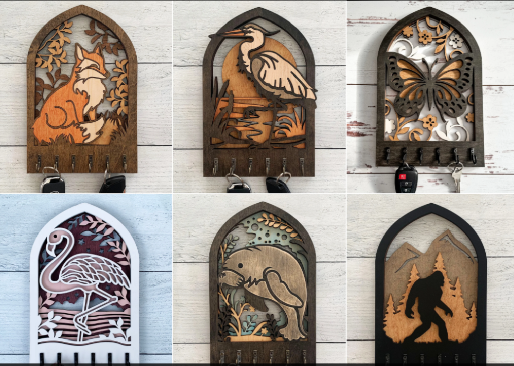 The designs are laser-ready and optimized for fast cuts, compatible with any laser machine. The key hangers are 10.3" high but are fully resizable. However, please note that resizing too small may require adjusting screw head sizes due to smaller screw holes. These files are perfect for makers, crafters, and small business owners looking to create and sell their products.